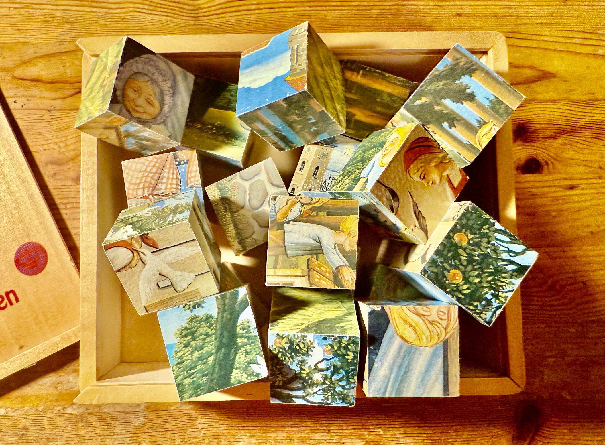 On a street that didn’t feel like mine, I met a puzzle. Twenty wooden blocks painted with fairy tale scenes. I turned them in my hands but gave up trying to solve anything.
